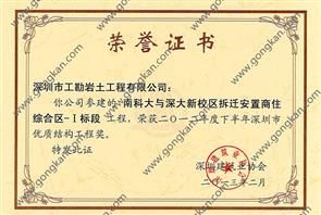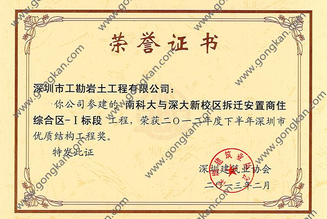 2013-深圳市优质结构工程《南科大与深大新校区拆迁安置商住综合区-Ⅰ标段》