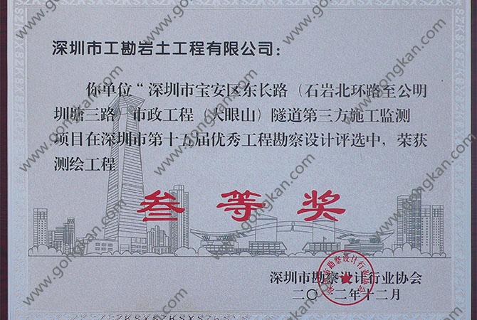 2012年度深圳市第十五届优秀工程勘察设计奖测绘工程三等奖《深圳市宝安区东长路(石岩北环路至公明圳塘三路)市政工程(大眼山)隧道第三方施工监测》