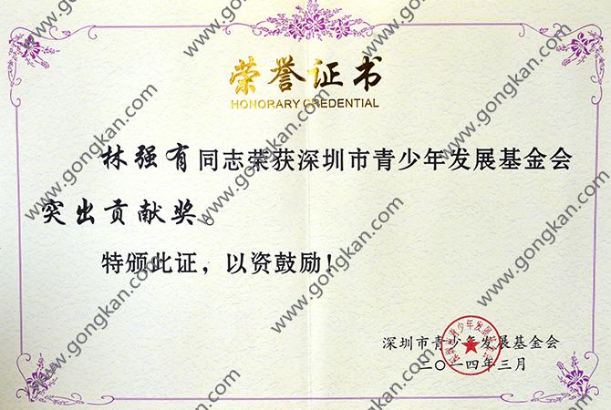 2014年林强有荣获深圳市青少年发展基金会突出贡献奖