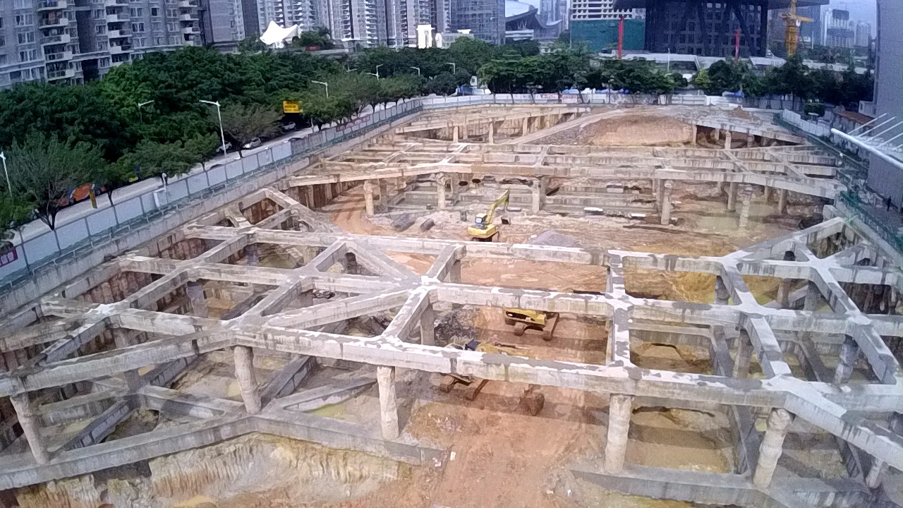 位于深圳市福田区。本项目总用地面积10811m2,地下5层,塔楼43层,裙房7层;基坑支护深度约21.65~24.05m,基坑周长约508.8m,基坑支护采用咬合桩+三道内支撑的支护形式;桩基础采用人工挖孔桩和抗拔锚杆两种形式。