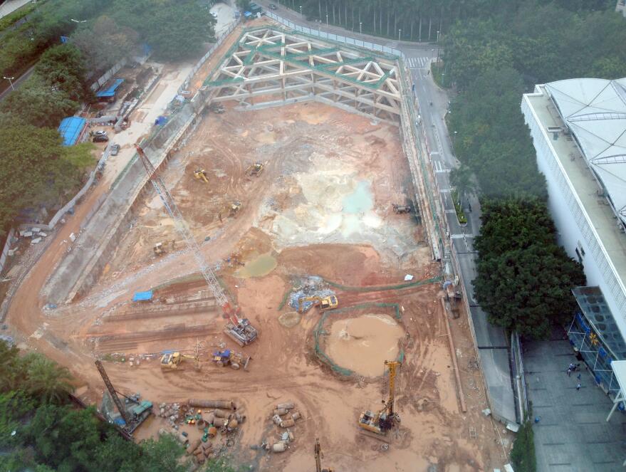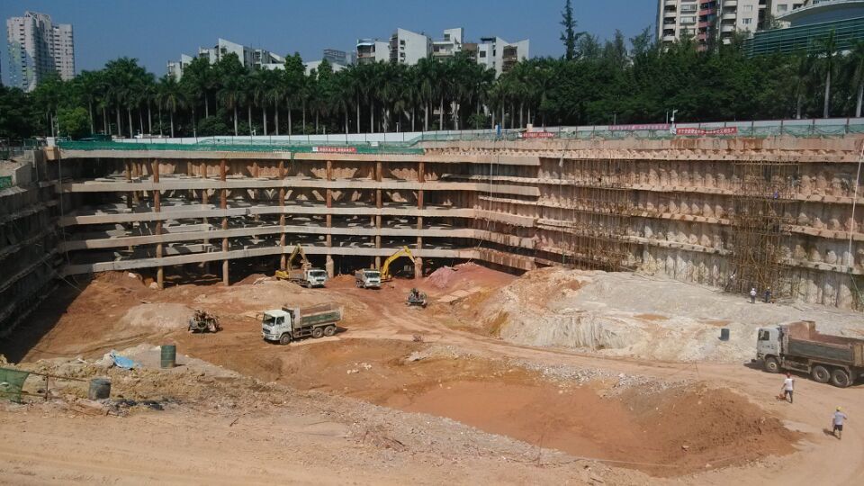 项目位于深圳市南山区华侨城内,限高300m超高层建筑,地下室5层。基坑深23~28m,采用钢筋砼支撑梁+咬合桩+三重高压旋喷桩+搅拌桩的支护方式。