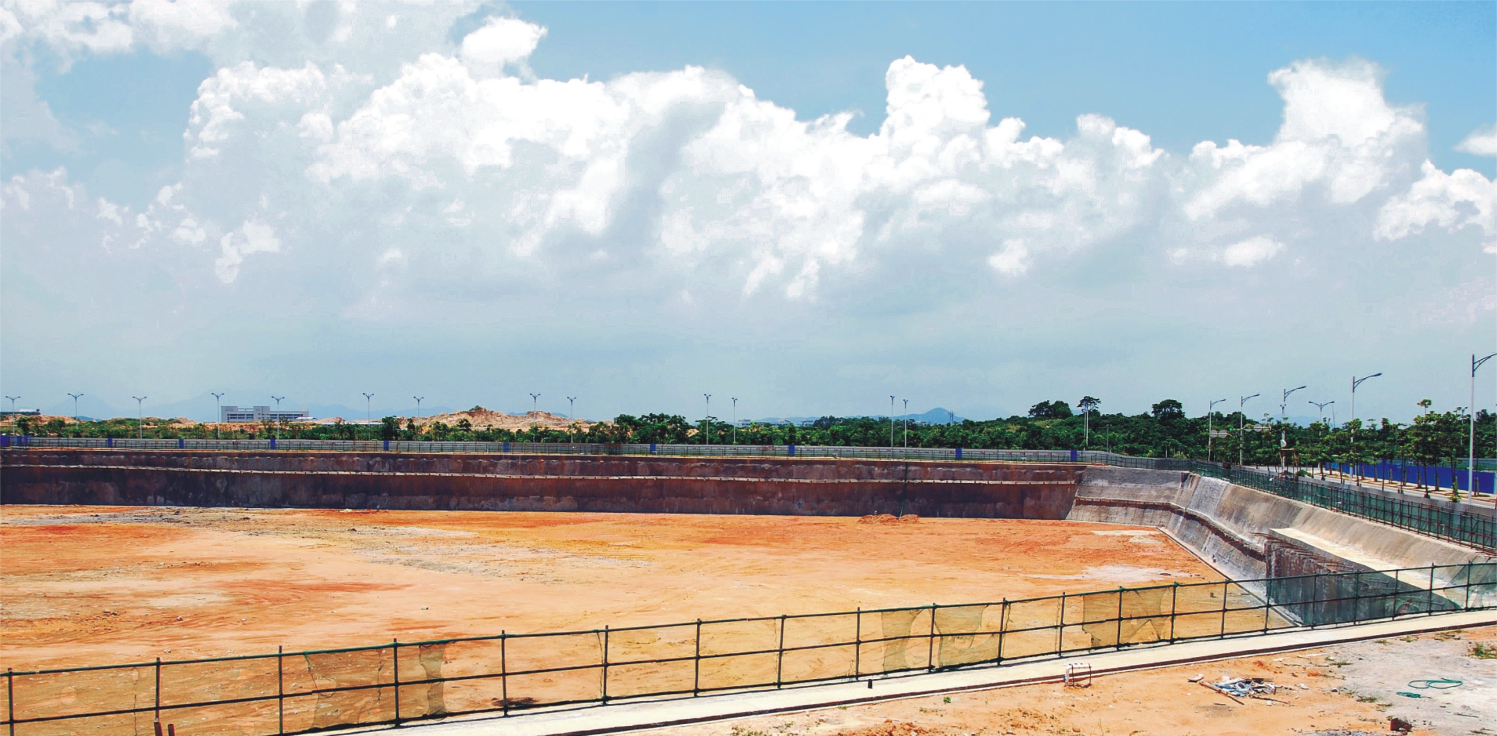 基坑内面积68573㎡,周长约1415m;基坑的支护形式为桩锚、放坡+复合土钉墙。